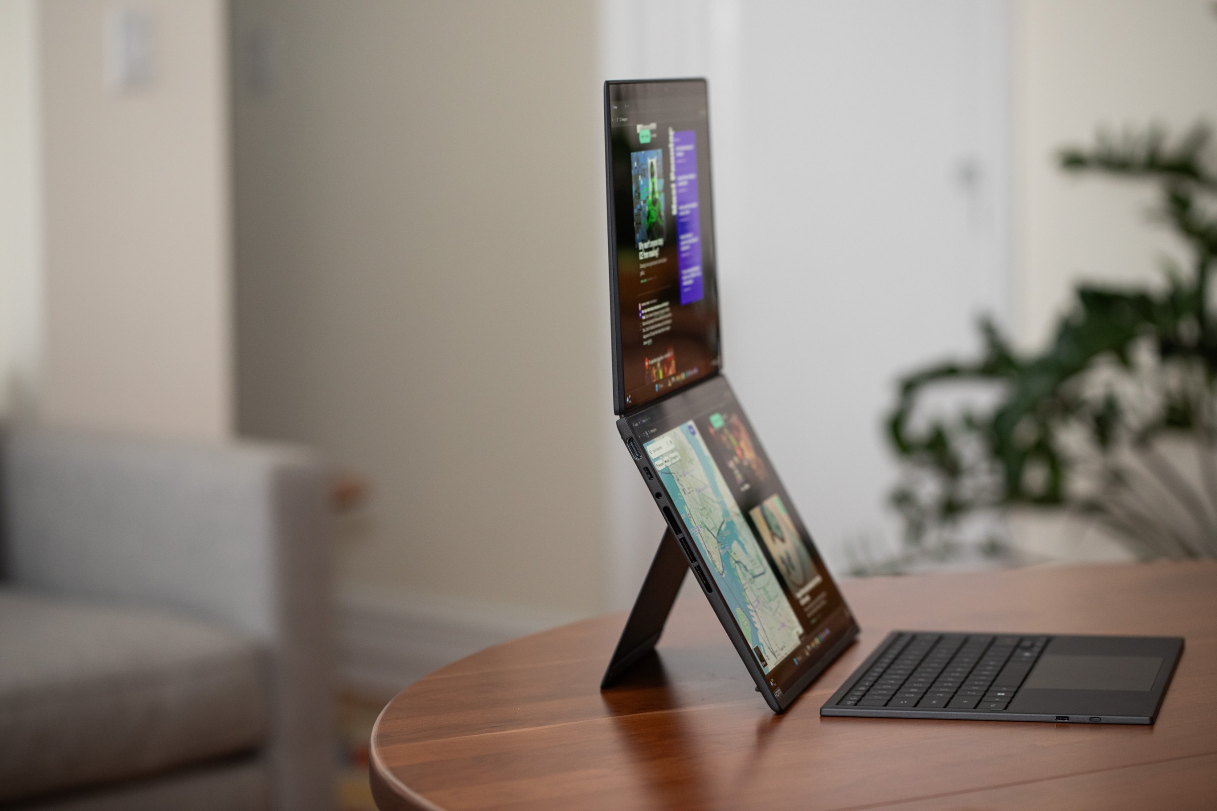 As I found when I tested Lenovo’s rollable laptop, getting more screen real estate whenever you need will absolutely spoil you. Lots of people use portable monitors for this, but having your second screen integrated into your laptop and perfectly matched to the main screen in resolution, size, and color is better. There’s more room to tile apps and windows across your workspace, and it’s easier to work on two documents at the same time with side-by-side vertical screens — which is what I’m doing as I write this review. And with the screens in extra-tall orientation you get a nice webcam angle that’s closer to eye level, easier on your neck, and a more pleasing representation of your mug — no tickets to double-chin city here.