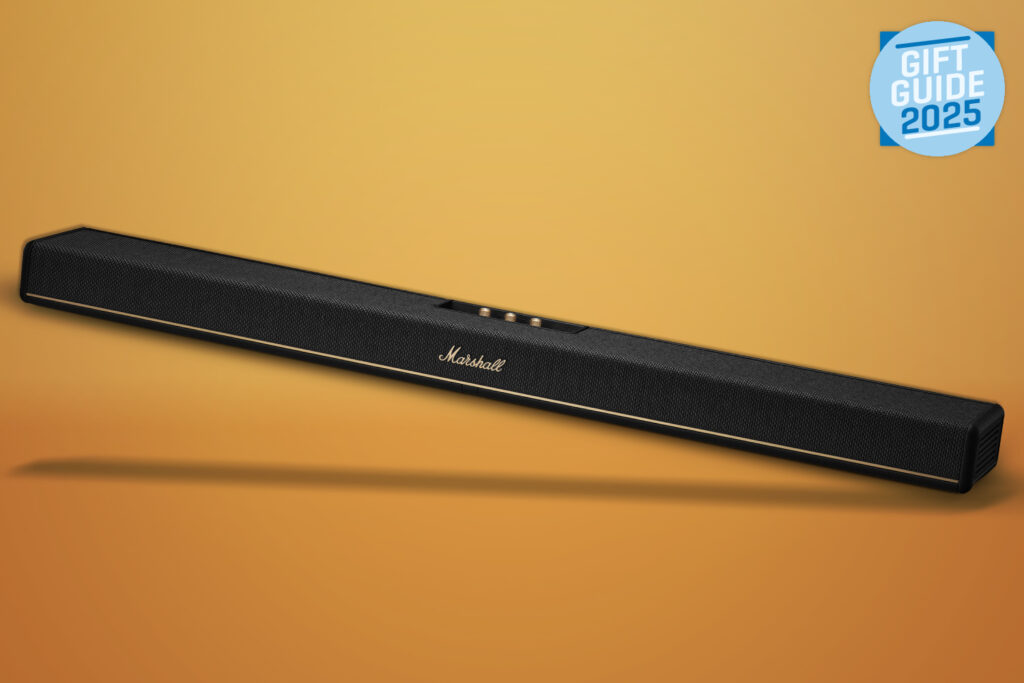Marshall’s first full-blown Dolby Atmos soundbar wouldn’t look out of place on centre stage. Roaring into life with the swagger you’d expect from the British amp icon, it looks every bit an amp, matching its guitar-loving siblings with a black finish, peppered gold detailing and equally shiny knurled ampknobs. Beneath its rocking exterior lies a 5.1.2 setup driven by 11 Class D amplifiers, filling your room with room-shaking movie sound and warm, powerful music playback that honours the brand’s heritage. The physical knobs for volume, treble and source add tactile Marshall charm.