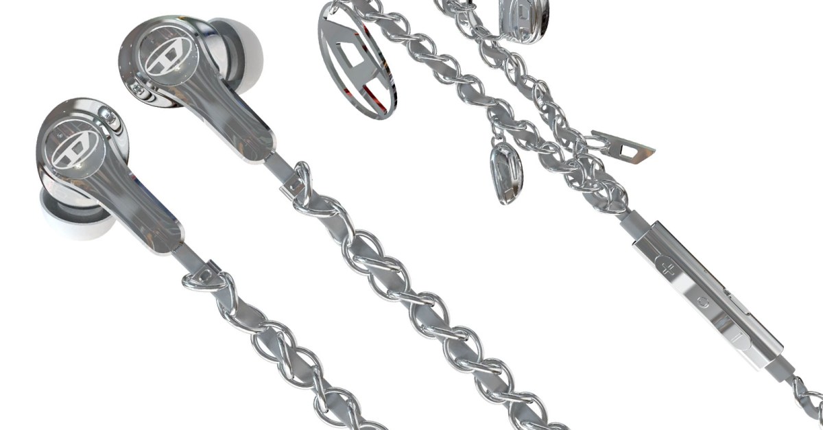 Diesel’s website doesn’t go into details about what drivers you’ll find inside its 60458 Wired Earbuds, but images reveal they’re designed to connect to mobile devices over USB-C, and include an inline remote with volume and playback controls, a microphone, and a sliding switch to mute the mic. The earbuds have a silver finish, but the chains wrapping the wires and attached charms (capitalizing on another trend) are actually made from less precious metals like aluminum and zinc.
