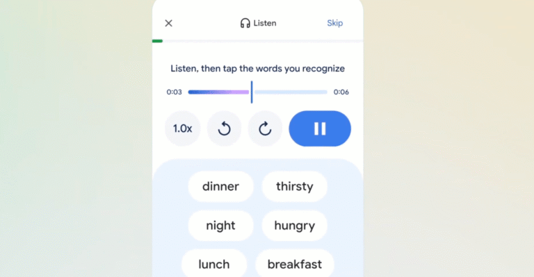 Google will then use its Gemini AI models to generate a lesson based on your response. If you tell Google that you have intermediate Spanish skills and want to communicate with your host family while studying abroad, Translate might create a recommended scenario to help you learn about meal times. From there, you can either practice speaking about the topic with Translate or listen to conversations and tap the words you recognize.