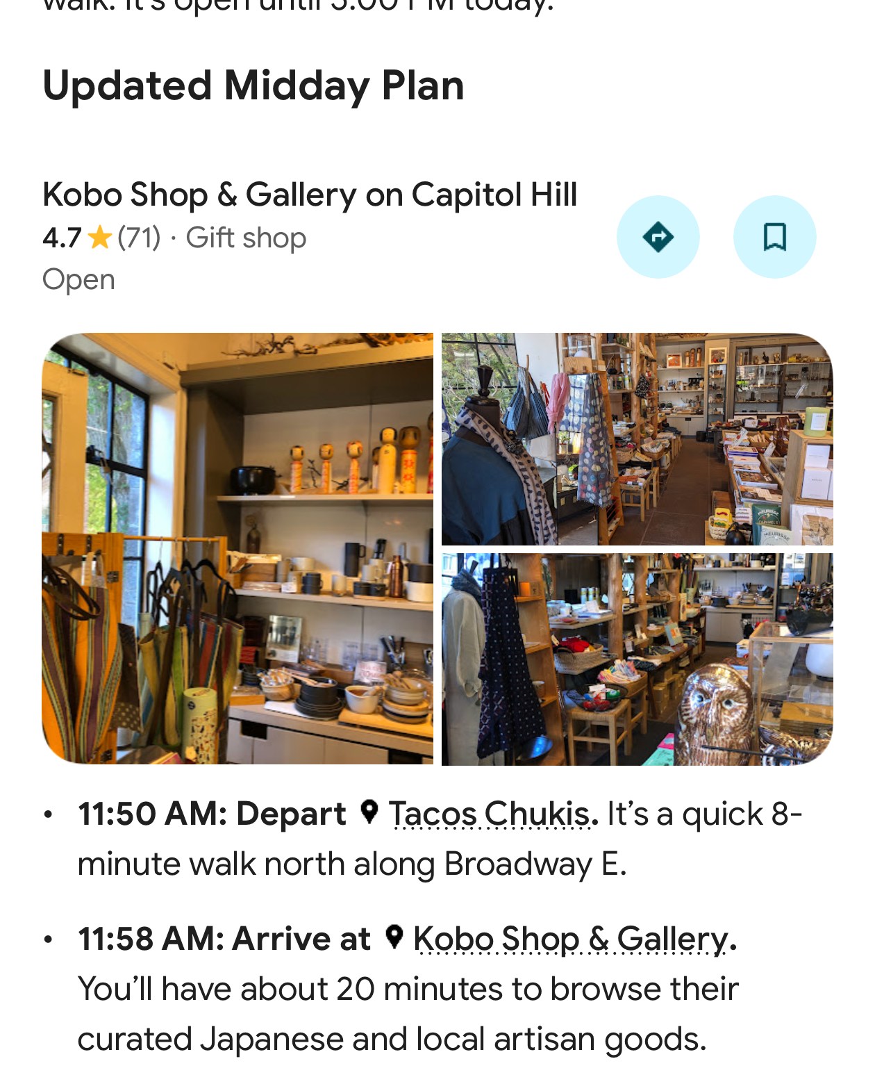 Gemini had big shoes to fill: my own. I’m a Google Maps fiend. I use it for normal stuff like getting around, but also, sometimes I just like scrolling around and seeing if anything new catches my eye. You can find some real gems this way. I’ve found bike routes, playgrounds, hidden parks, and new coffee shops to try. I’d spend all day every day wandering around Seattle on public transit going to bookstores and fancy stationery shops if I could. It’s how I usually spend a day off, but I also tend to get overwhelmed by the endless possibilities and just wind up visiting one of a couple of neighborhoods I know well. So I had Gemini chart me a path into less familiar territory.