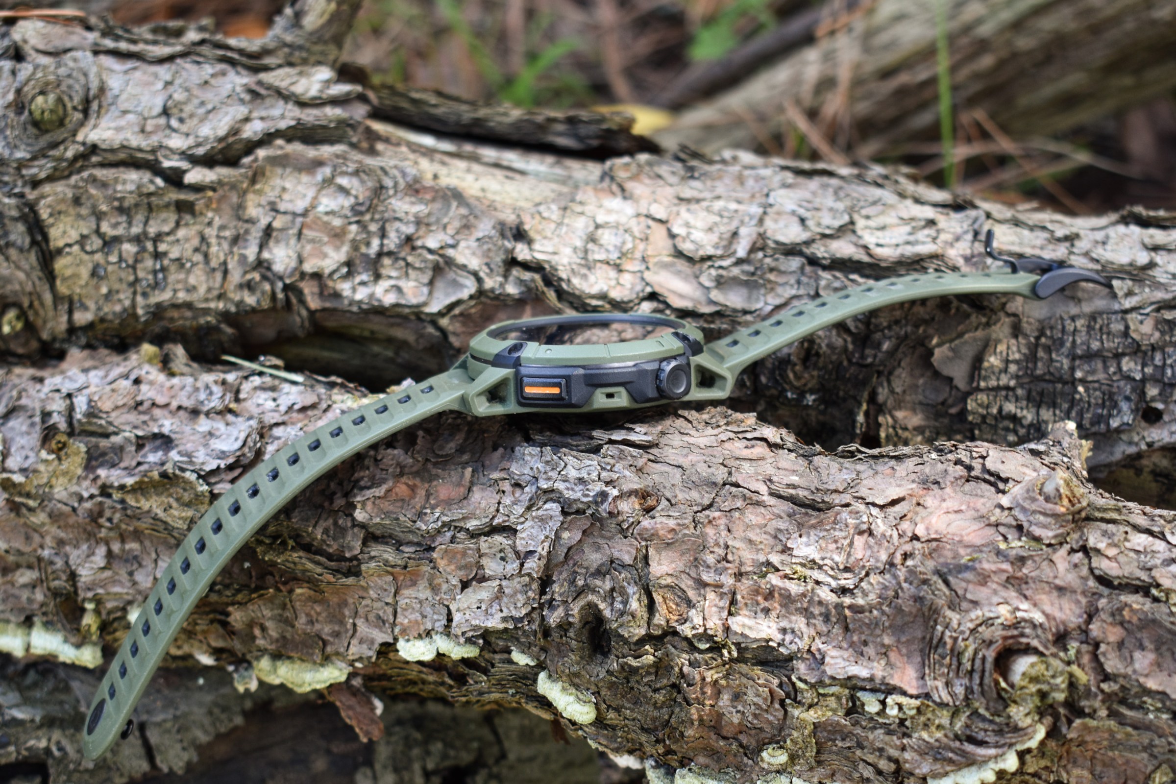 A Coros Nomad Watch rests on a fallen log