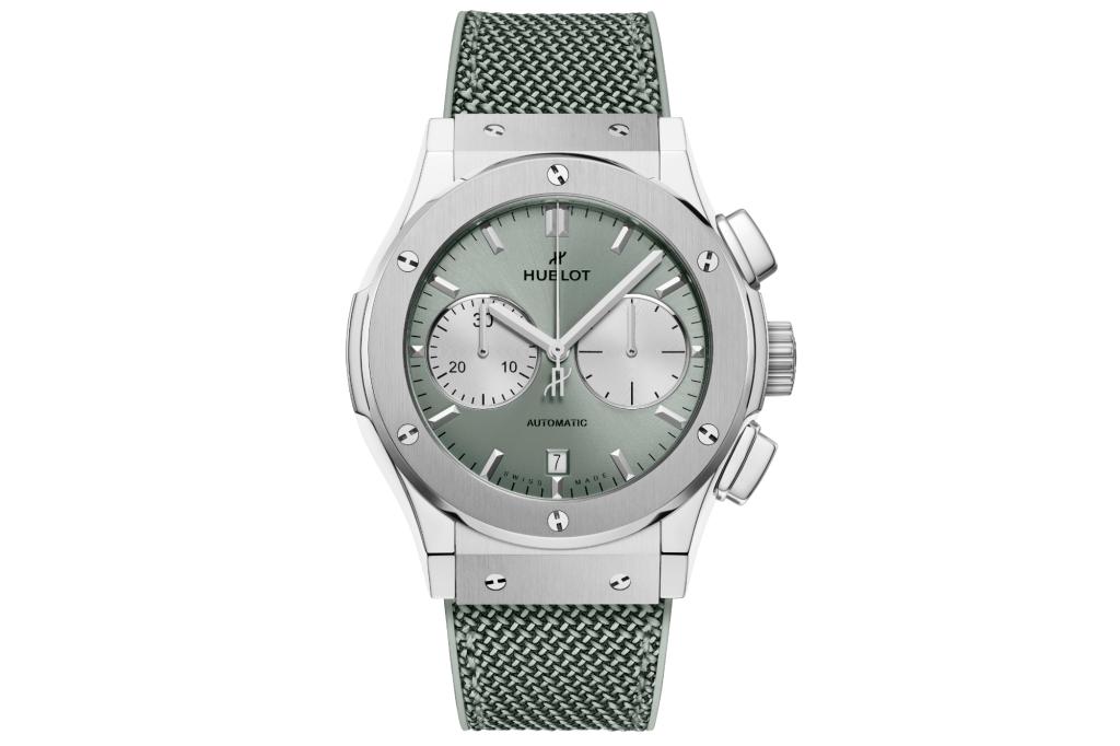 Hublot has also introduced three new Classic Fusion models finished in a pastel sage green, tapping into one of the strongest colour trends in watches right now. The new shade arrives across 33mm, 42mm and 45mm versions, all housed in lightweight titanium cases and paired with matching rubber-and-fabric straps. Each model shares the same clean, open dial layout that defines the Classic Fusion line.