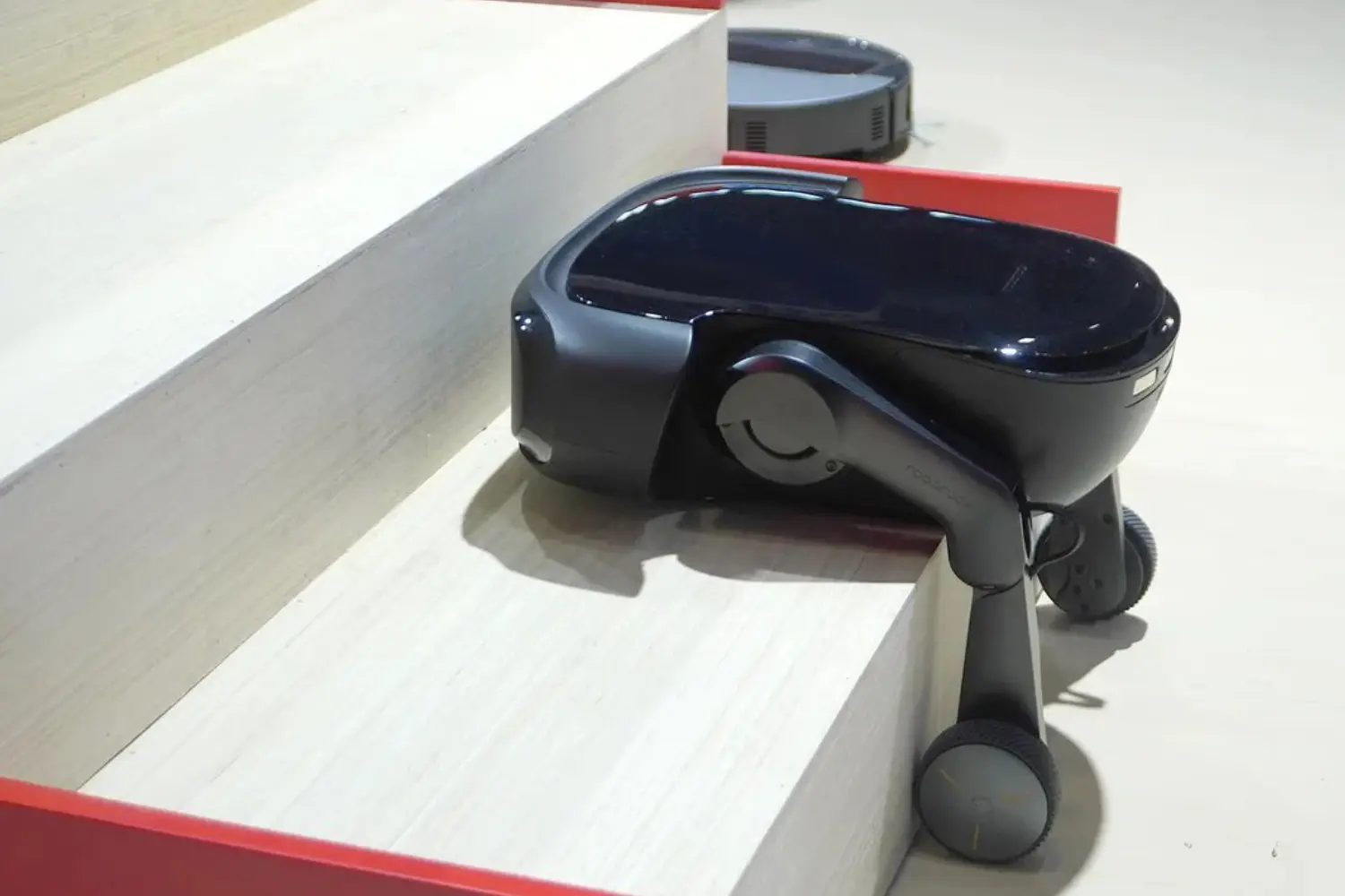 The Saros Rover goes for it anchors itself with one leg, hoists up, cleans the step, then repeats. Eufy’s Marswalker that was shown off last year can’t do that, and is nowhere to be seen. The legs are fully integrated. That means no extra attachments, just one unit climbing stairs and stepping over obstacles.