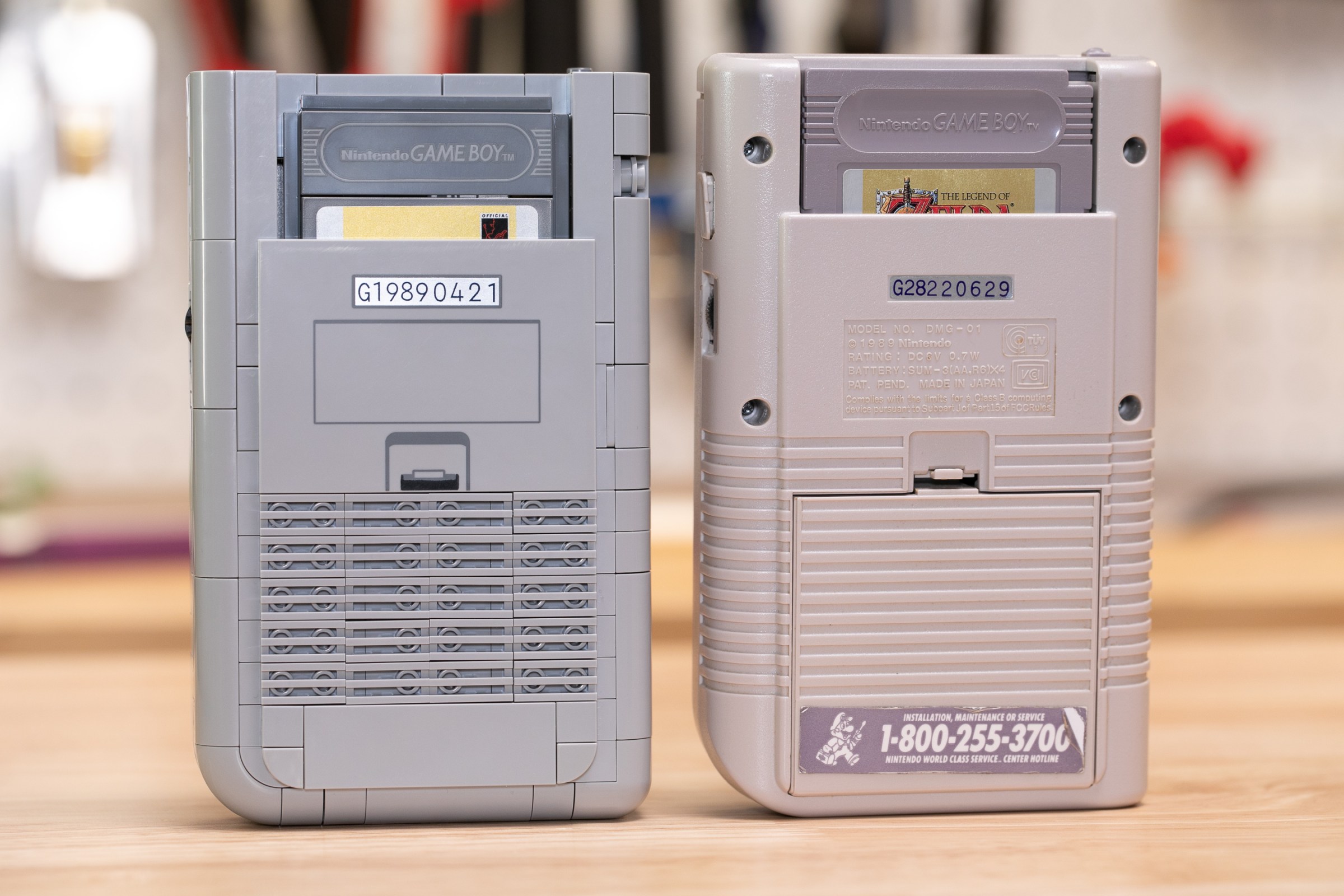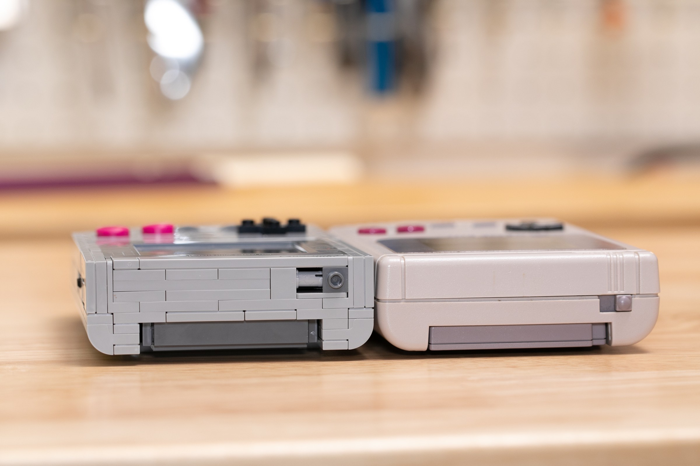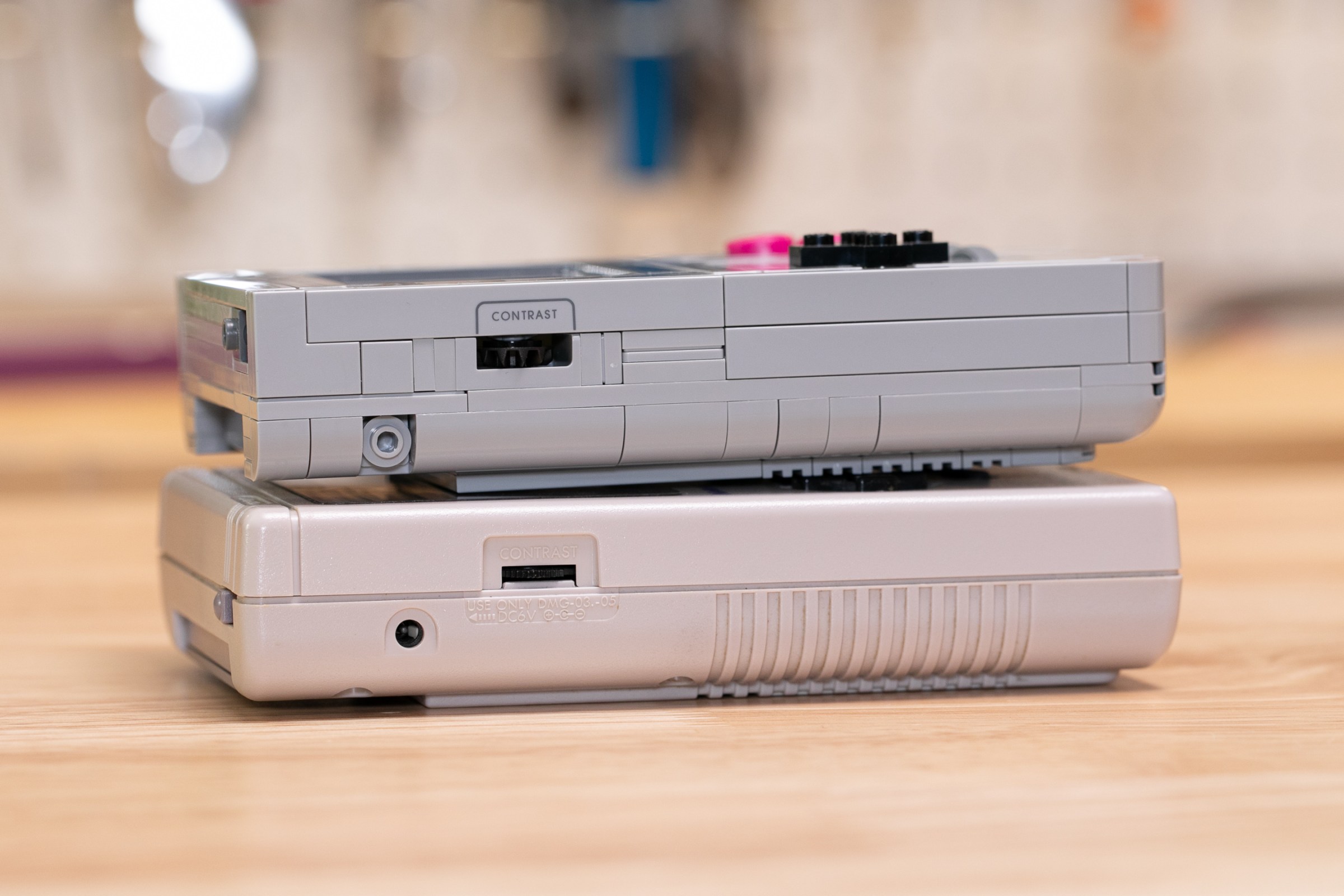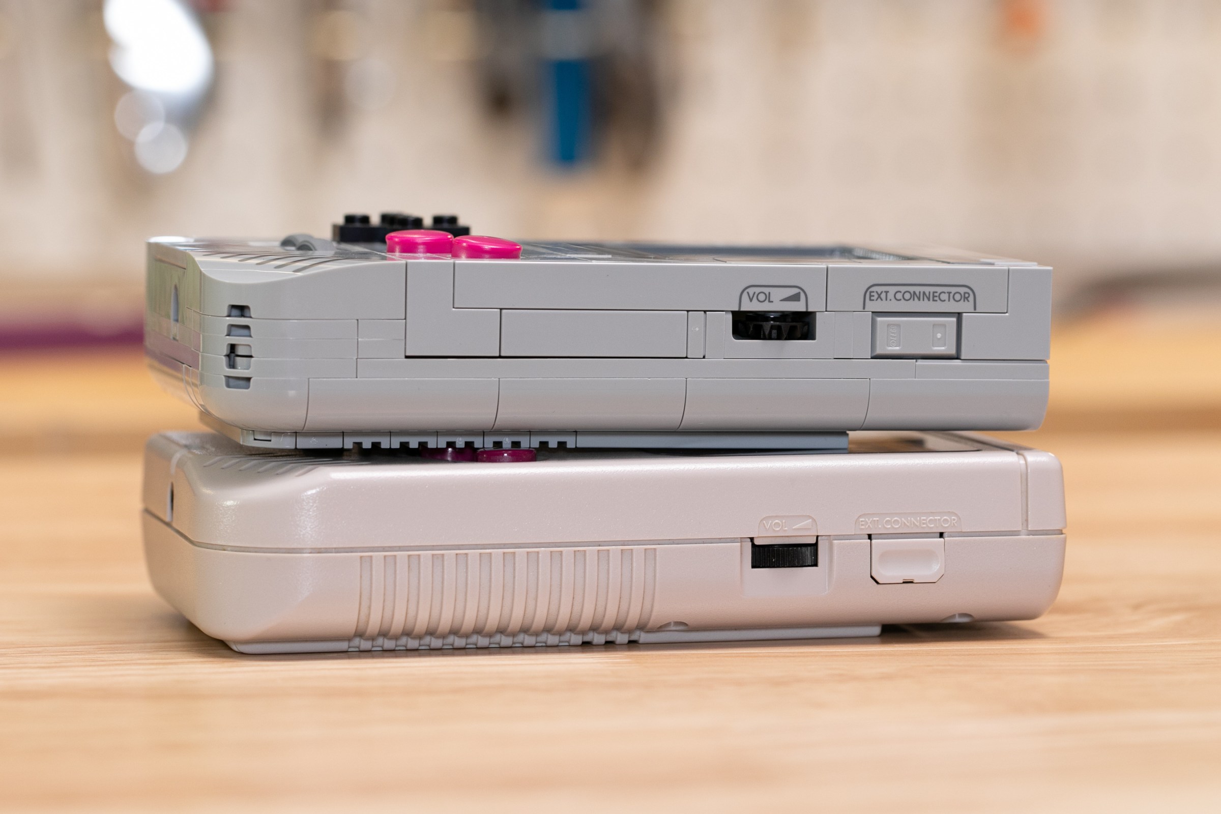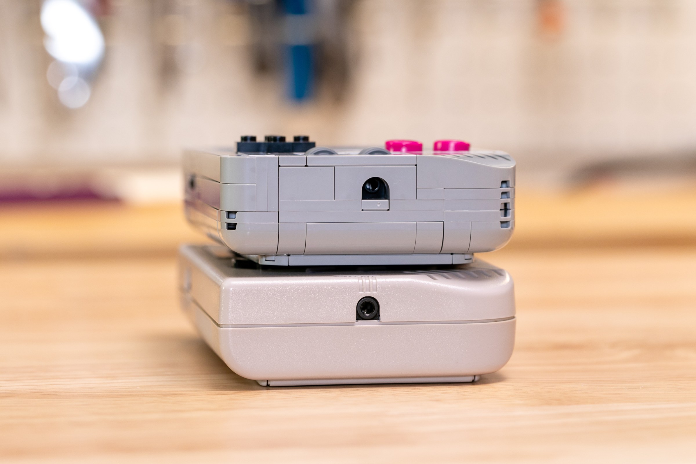 Comparing the Lego Game Boy to the original from every angle, you can see lots of places where there are slight gaps between the tiles, sure. But you can also see that almost every complex curve and label is represented, and while it weighs a few ounces less than the original, it’s almost the exact same size.