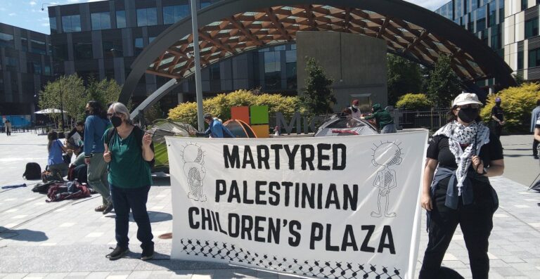 On Tuesday, a group of current and former Microsoft employees, as well as community members, took over a plaza at Microsoft’s headquarters in Redmond, Washington, as part of a No Azure for Apartheid protest. They declared the area a “Liberated Zone” encampment and said they had changed its name from East Campus Plaza to “The Martyred Palestinian Children’s Plaza.” The organization, which announced and distributed pictures of the takeover in a press release, said around 50 people were in attendance at the start of the event.