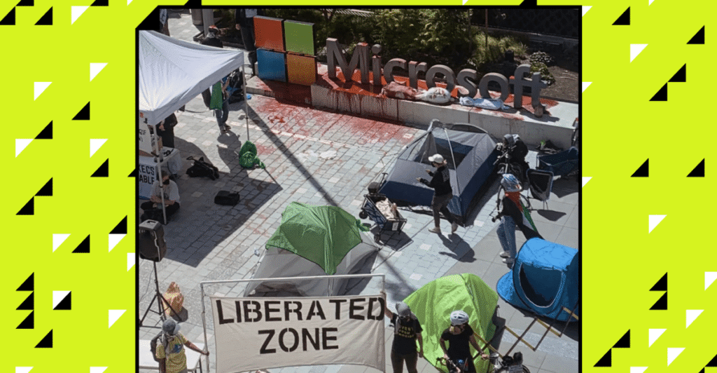 Days later, protesters arrived at Microsoft’s headquarters to start an encampment. A group of current and former Microsoft employees, as well as community members, took over a plaza at Microsoft’s headquarters. Protesters were moved to a public area outside of Microsoft’s campus on the first day of those protests last week, but things got heated when they returned on the second day.