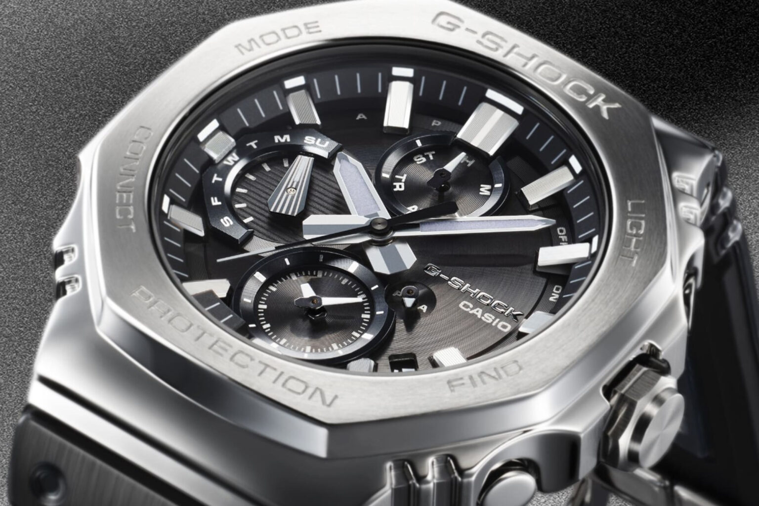 The gunmetal finish under that transparent top layer gives it a nice depth, almost like the colour shifts when you move your wrist. You also get Bluetooth, Tough Solar, and an LED light bright enough to find your keys under the sofa. If you’re after the full metal experience, this is it.