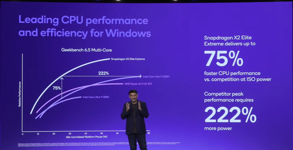 While it doesn’t say which competitors it’s talking about in the press release, it appears that Qualcomm is comparing against some of the most powerful (and power-hungry) laptop chips in the market, including the Intel Core Ultra 9 285H and AMD Ryzen AI 9 HX 370, and you can see Qualcomm isn’t labeling both axes of its graphs: