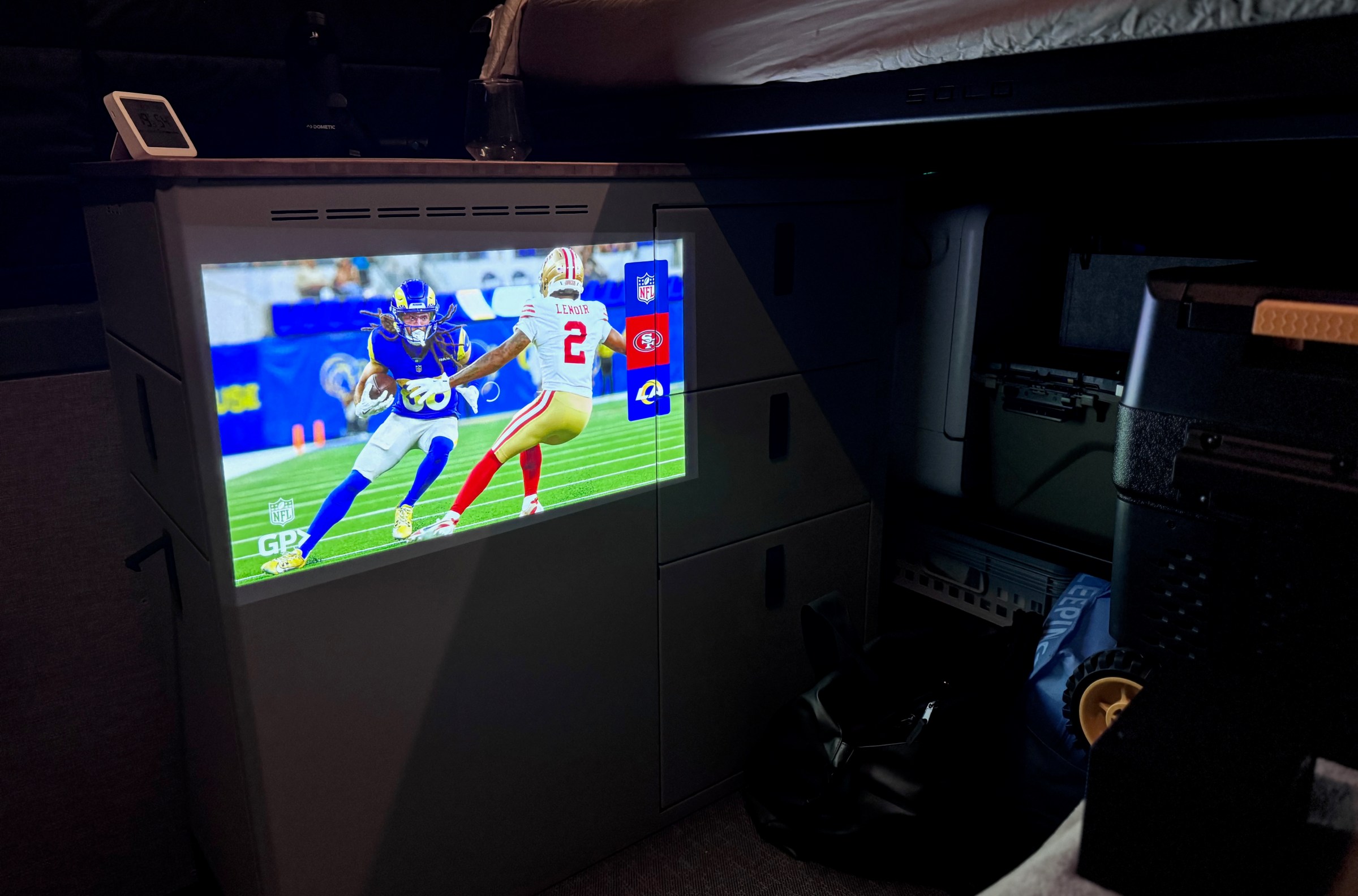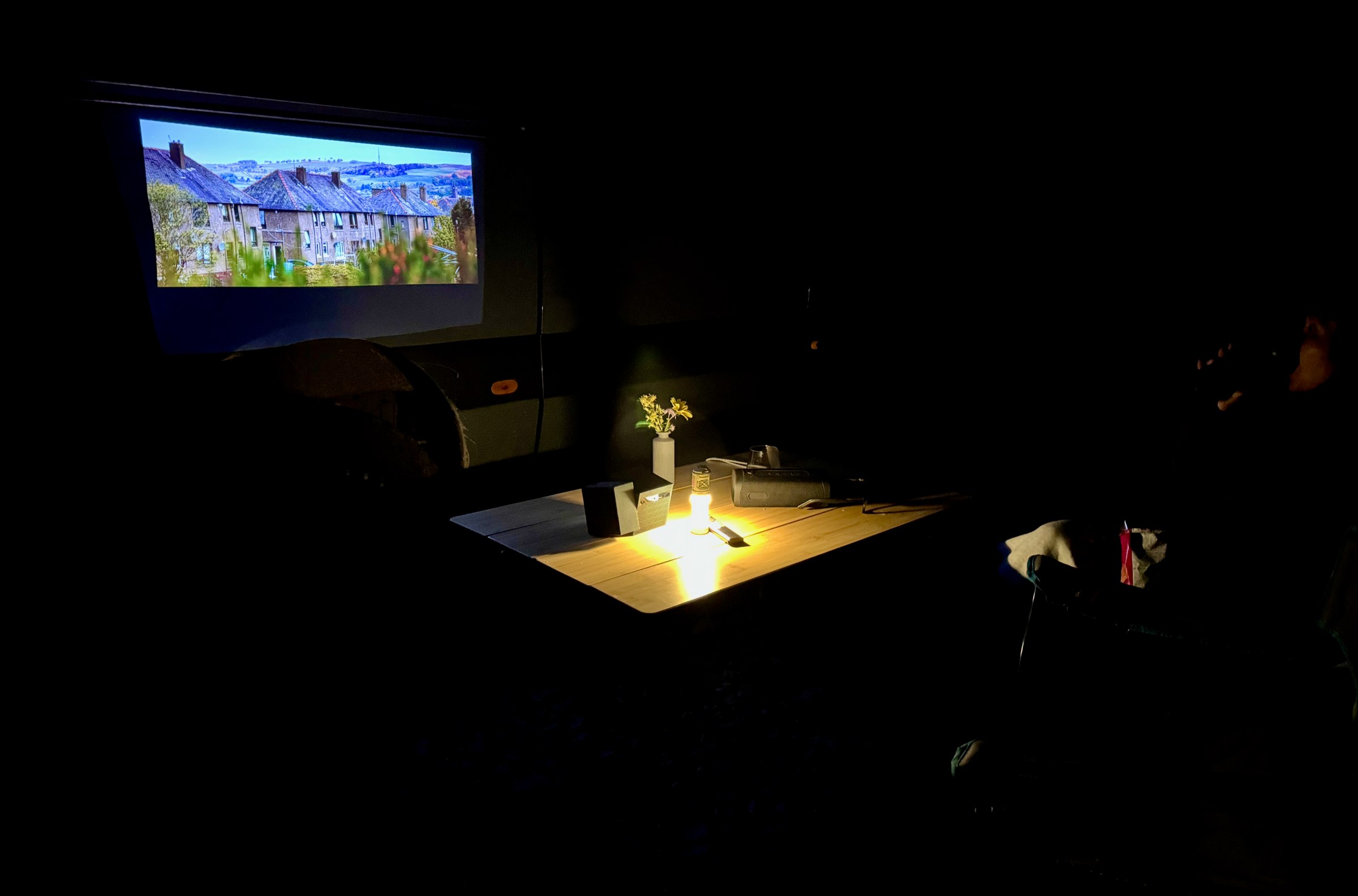 It’s bright enough to watch videos during the day when all those lumens are focused into a tight 30-inch rectangle inside my van, or at 100-inches when projected against it at night. Unfortunately, it doesn’t have that color-adaptation tech found on Samsung’s new (battery-less) Freestyle+ projector, so the blue-gray hull affected the palette. Regardless, it was still very watchable.