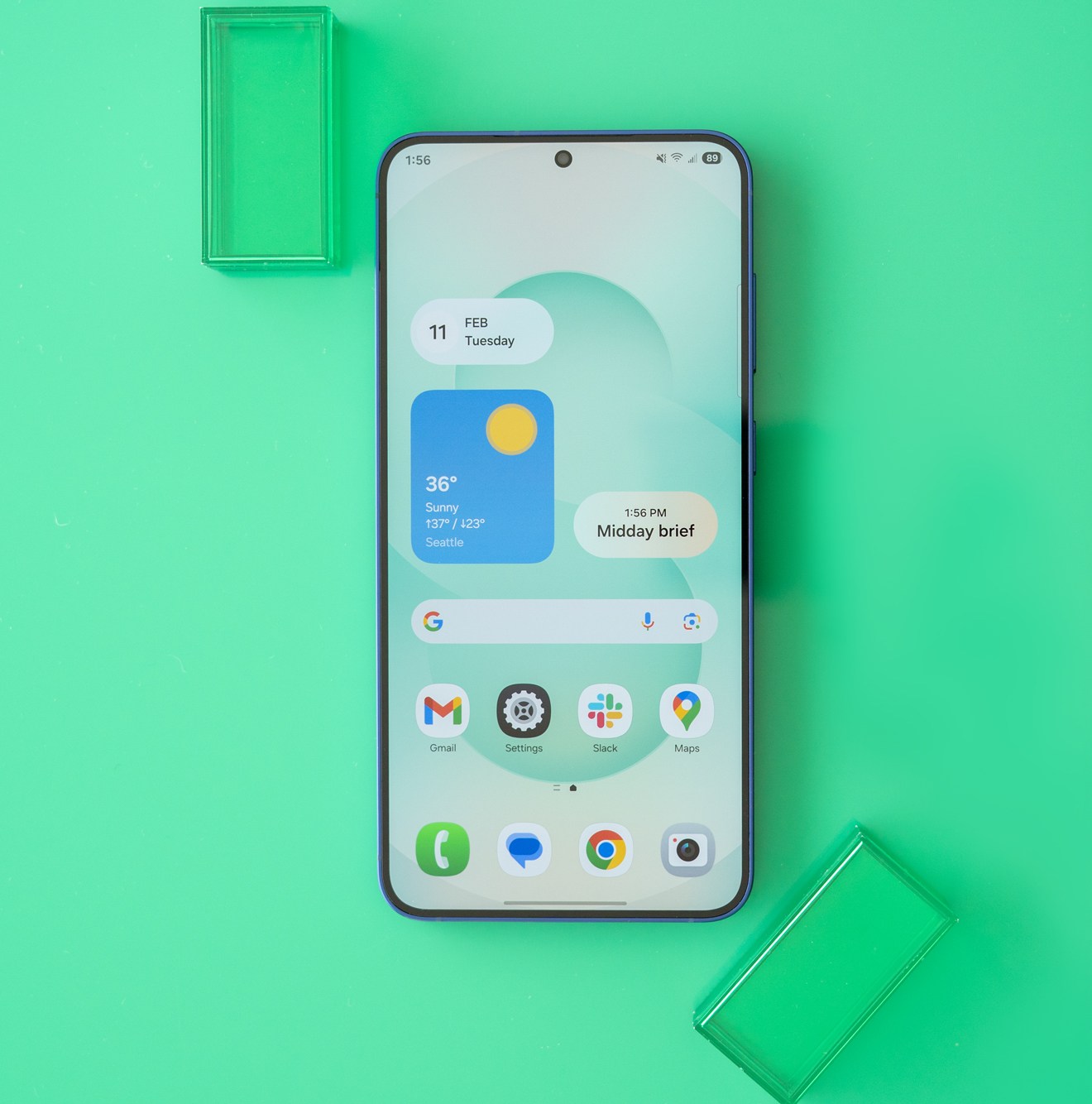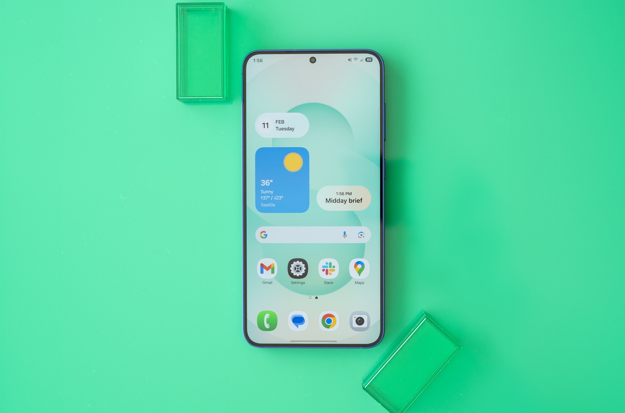 Samsung Galaxy S25 Ultra showing homescreen on a green and yellow background.Samsung Galaxy S25 Ultra showing homescreen on a green and yellow background.