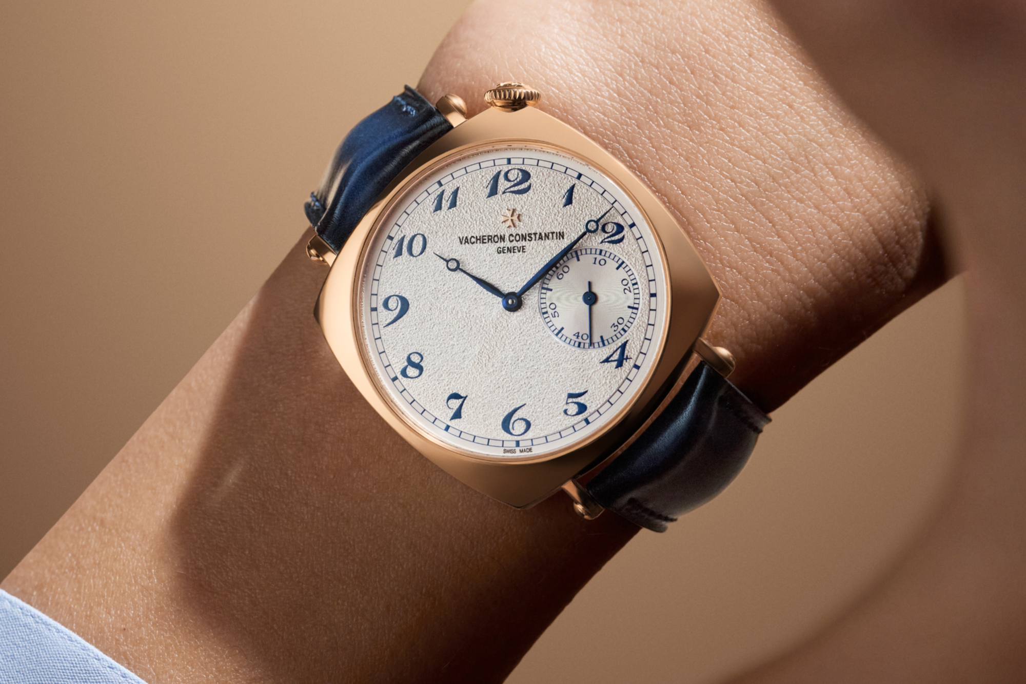The new versions, offered in 36.5mm and 40mm in 18K pink gold, introduce a grained silver dial with blue Arabic numerals and open-tipped blued gold hands. It’s finished with a gradient dark blue patinated calfskin strap.
