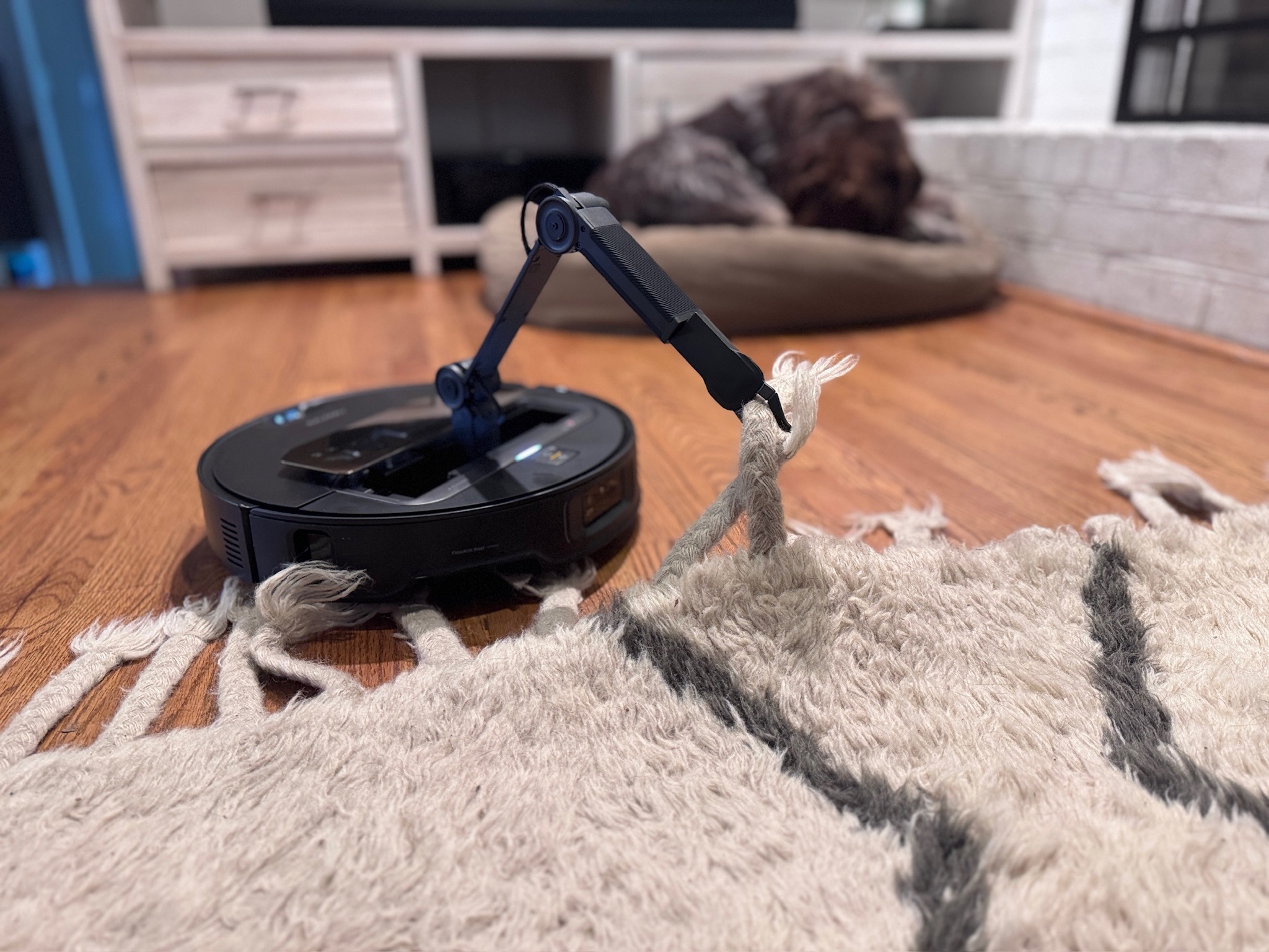 There’s no camera on the bot, so its obstacle detection isn’t great. It dodged socks and shoes, but cables and shoe laces proved problematic, as did fake pet poop. If you want more accurate obstacle avoidance, which you might need if your pet has accidents, upgrade to the Freo Z10 Ultra. It costs $200 more but adds dual HD cameras for AI-powered detection.